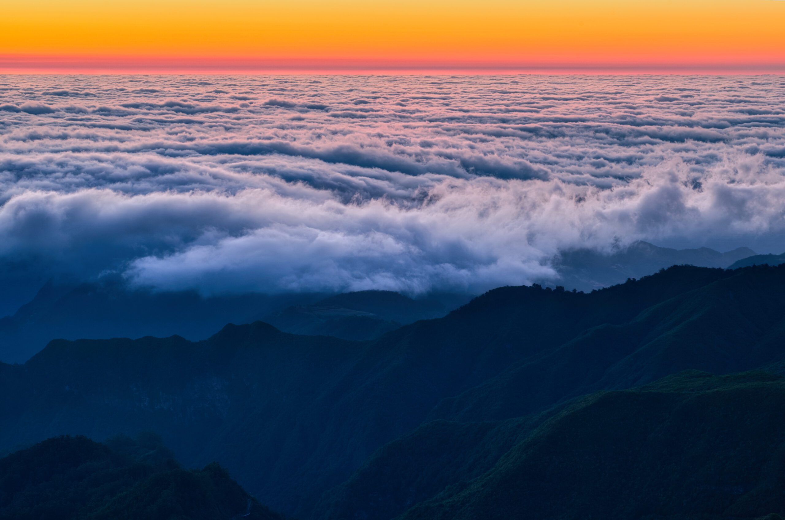 This spectacular shot takes the viewer high above the mountain peaks, where a sea of clouds gently stretches across the landscape. The glowing horizon, tinted with warm oranges and yellows of the sunrise, creates a striking contrast to the deep blues of the clouds and mountains below. The soft, almost fluffy texture of the cloud cover conveys a sense of calm and weightlessness, while the silhouettes of the mountains provide a soothing yet majestic presence in the lower half of the frame. This scene captures the magic and grandeur of a moment experienced only above the clouds.