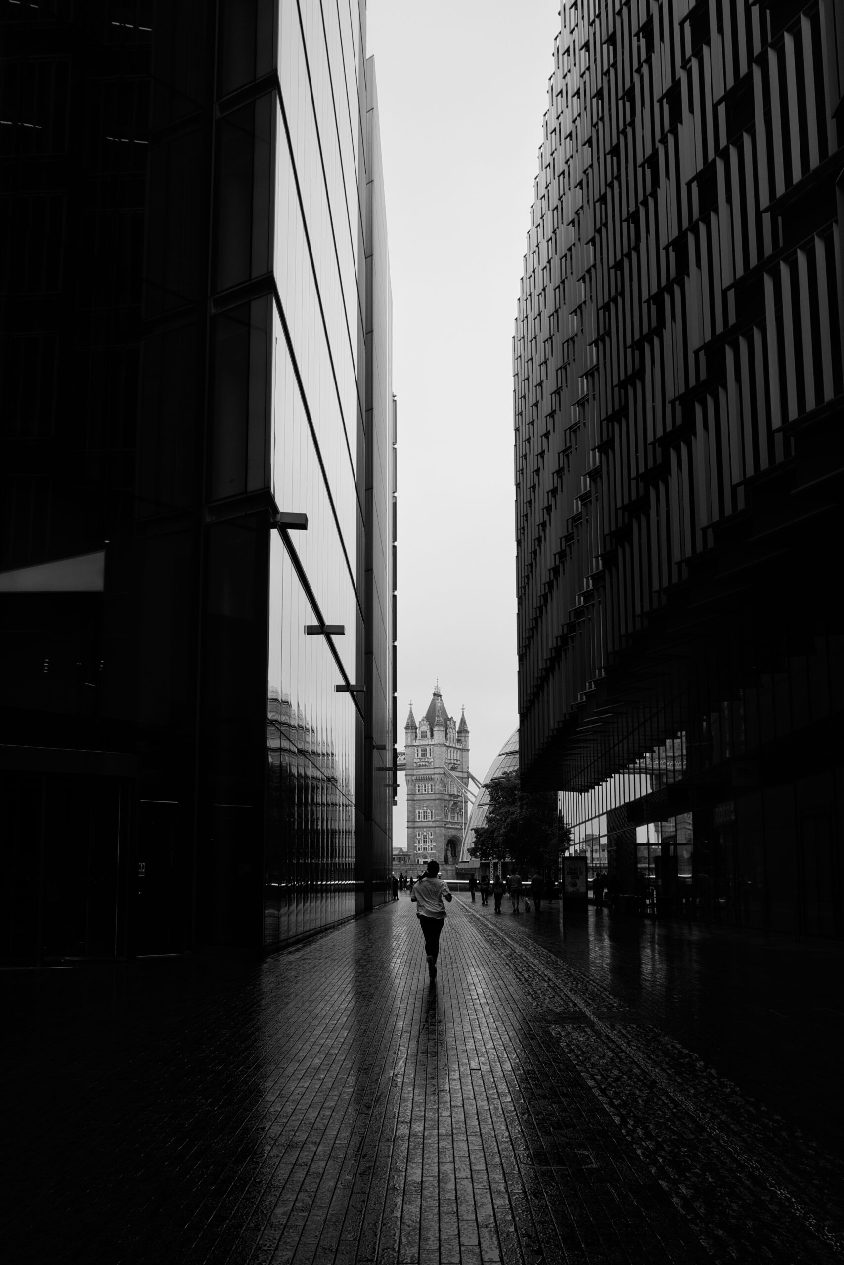 A lone runner traverses a narrow alley of modern buildings with reflective facades dominating the scene. At the end of the corridor rises the historic silhouette of Tower Bridge, standing in stark contrast to the towering glass structures. This black-and-white composition highlights the fusion of old and new London, conveying a sense of time travel amidst urban modernity.