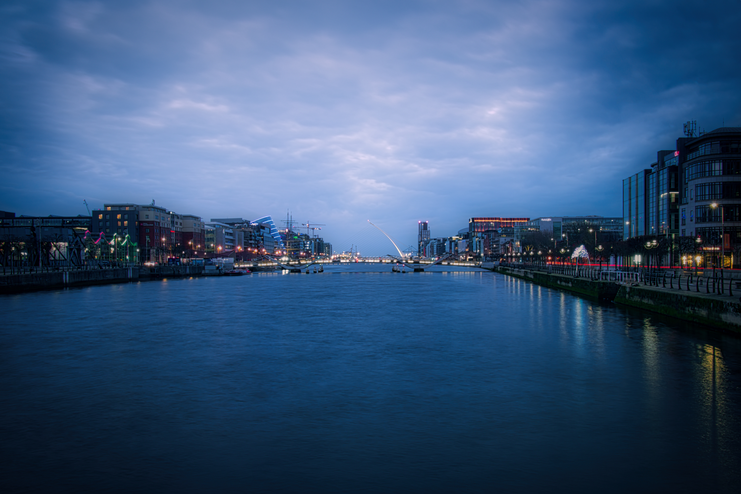 As the day winds down and the city settles, a gentle blue cloaks Dublin. The River Liffey becomes a mirror, catching the final glimmers of daylight and the colorful reflections of city lights. On either side, modern buildings glow quietly, and in the distance, the elegant arc of the Samuel Beckett Bridge stretches across the water. This scene captures the rhythm of a city that continues to flow, even in the quiet of twilight.