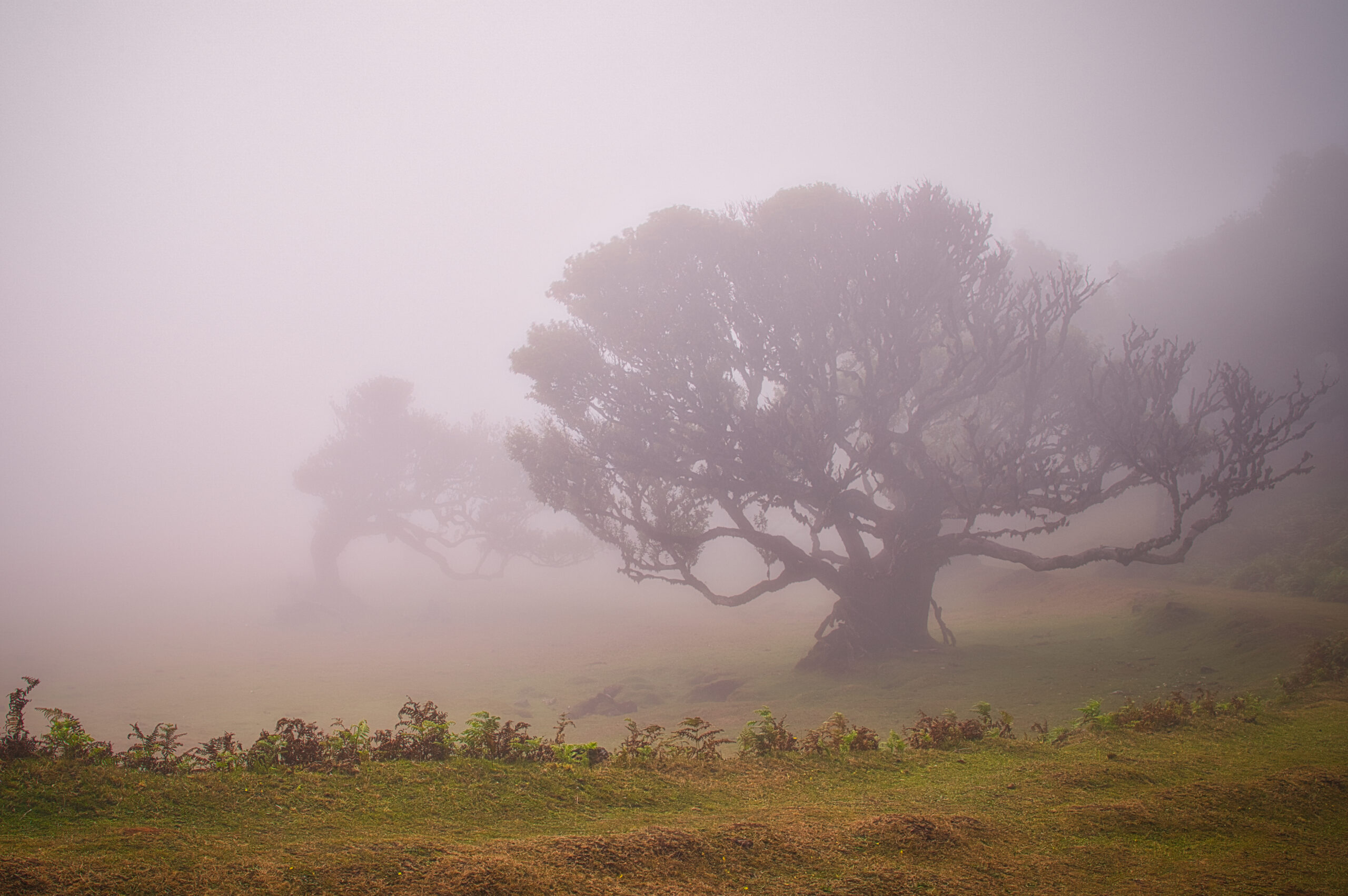 Amidst a dense fog, the silhouetted forms of ancient trees appear like ghostly beings performing a silent dance. The thick branches, outlined against the misty background, lend a mystical atmosphere to the scene. The fog obscures the landscape’s details, making the trees seem like a faint memory from a long-lost time. This photograph captures the enchantment and melancholy of a place that seems to keep its secrets hidden in the mist.