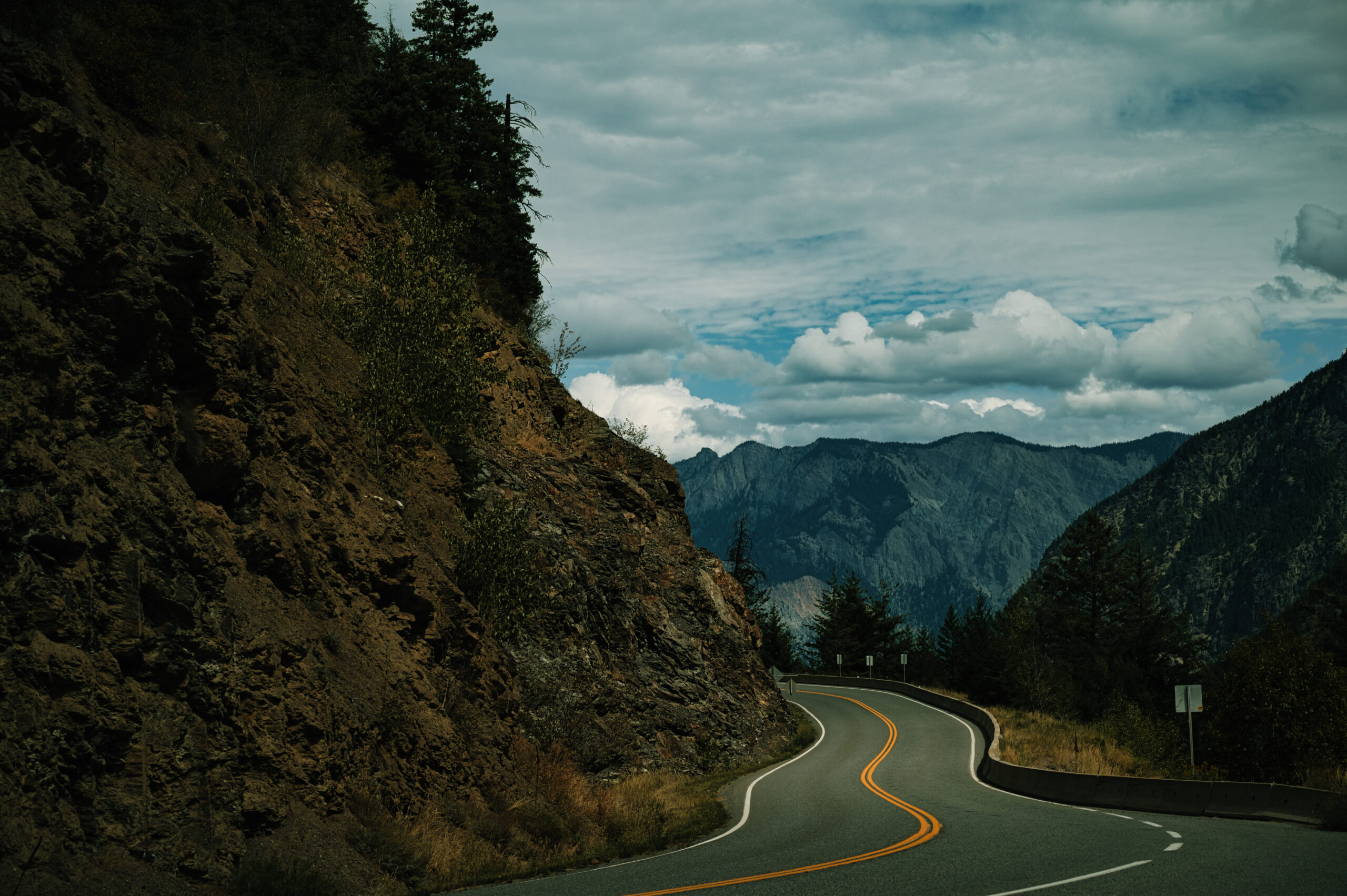 At the Duffey Lake Road viewpoint near Lillooet in British Columbia, the road winds with sharp curves through a mountainous setting. On the left, a steep rock face rises with brown stone and sparse vegetation. Behind it, the ranges of the Coast Mountains stretch across the horizon, their dark-blue silhouettes appearing beneath a dense cover of clouds. The sky is filled with contrasting cloud formations that add dynamic structure. The double bend of the asphalt guides the viewer’s gaze deep into the image, from the rocky foreground to the distant mountains.