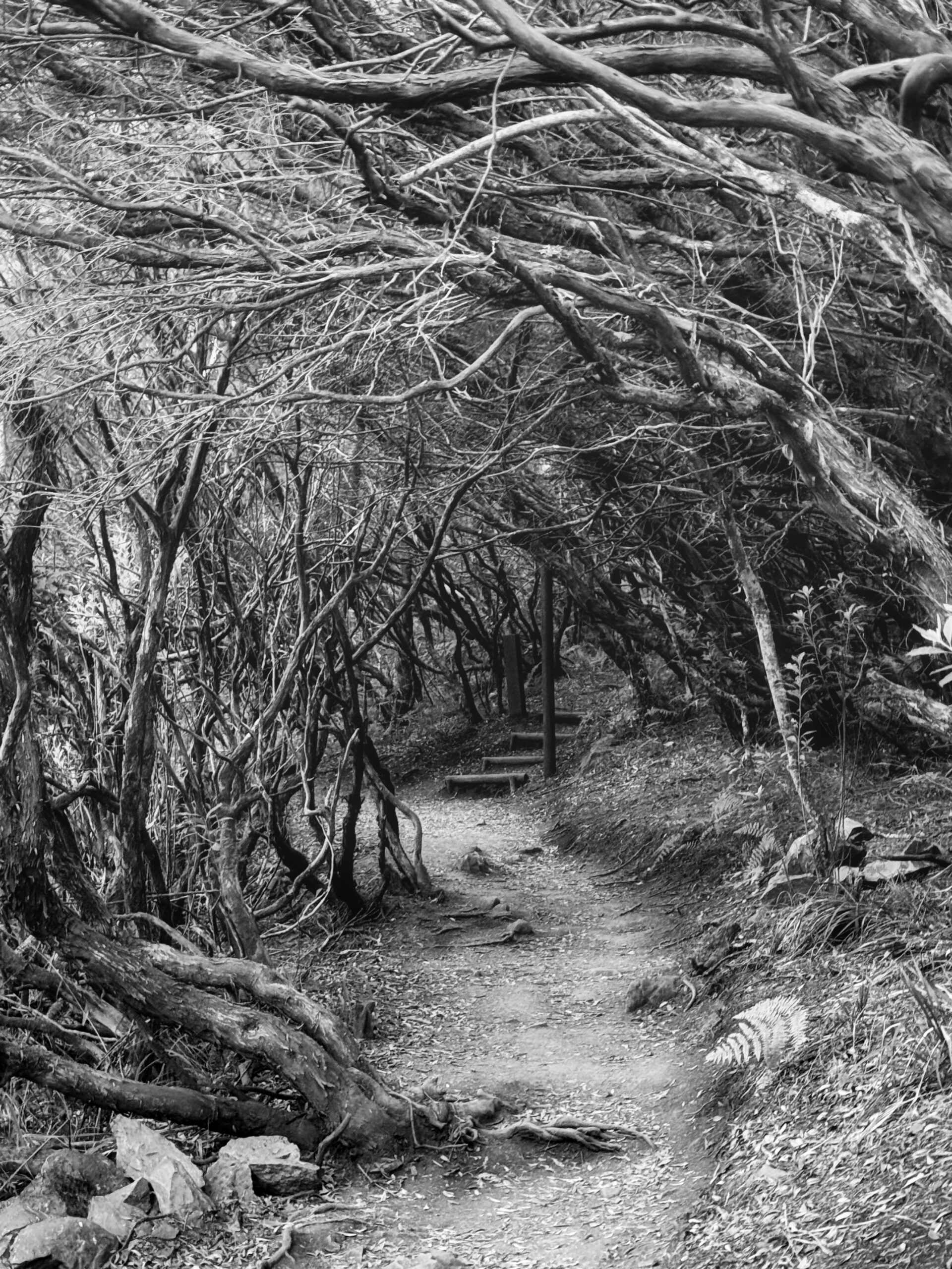 This black and white photo reveals the mysterious beauty of an enchanted path deep within the woods of Madeira. The gnarled, intertwined branches form a natural archway over the narrow, earthy trail that leads into uncertainty. The monochrome tones enhance the mystical and timeless feeling, as if stepping into another world, far removed from the hustle and bustle of everyday life.