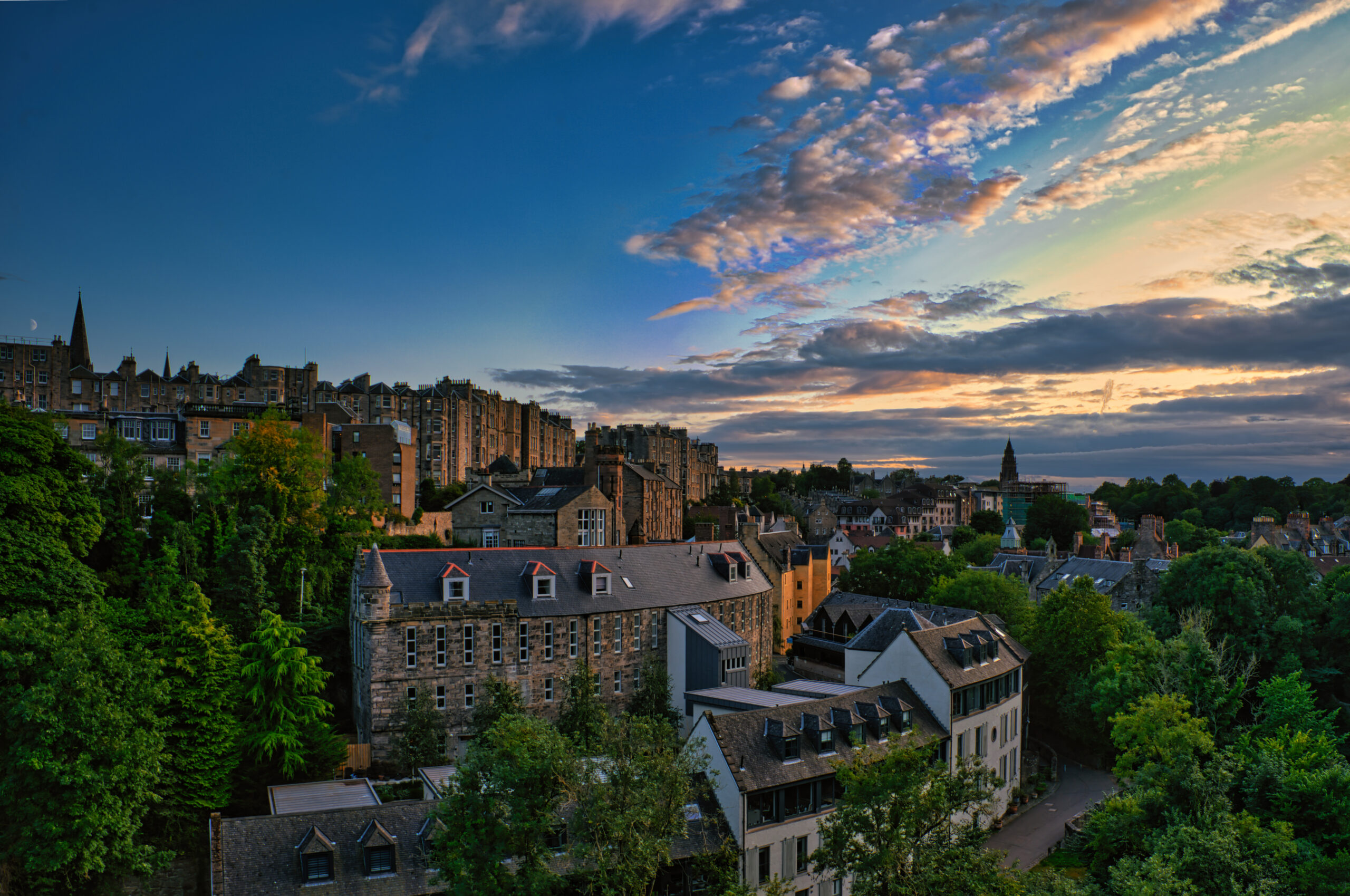 As the sun dips closer to the horizon, it bathes the old town in a golden glow. The dramatic cloud formations stretching across the sky echo the mood of a city that blends history and modernity. The ancient sandstone façades speak of centuries past, while the surrounding greenery adds a touch of freshness and vibrancy. This elevated view invites the viewer to wander across the rooftops and admire the harmony between nature and architecture.