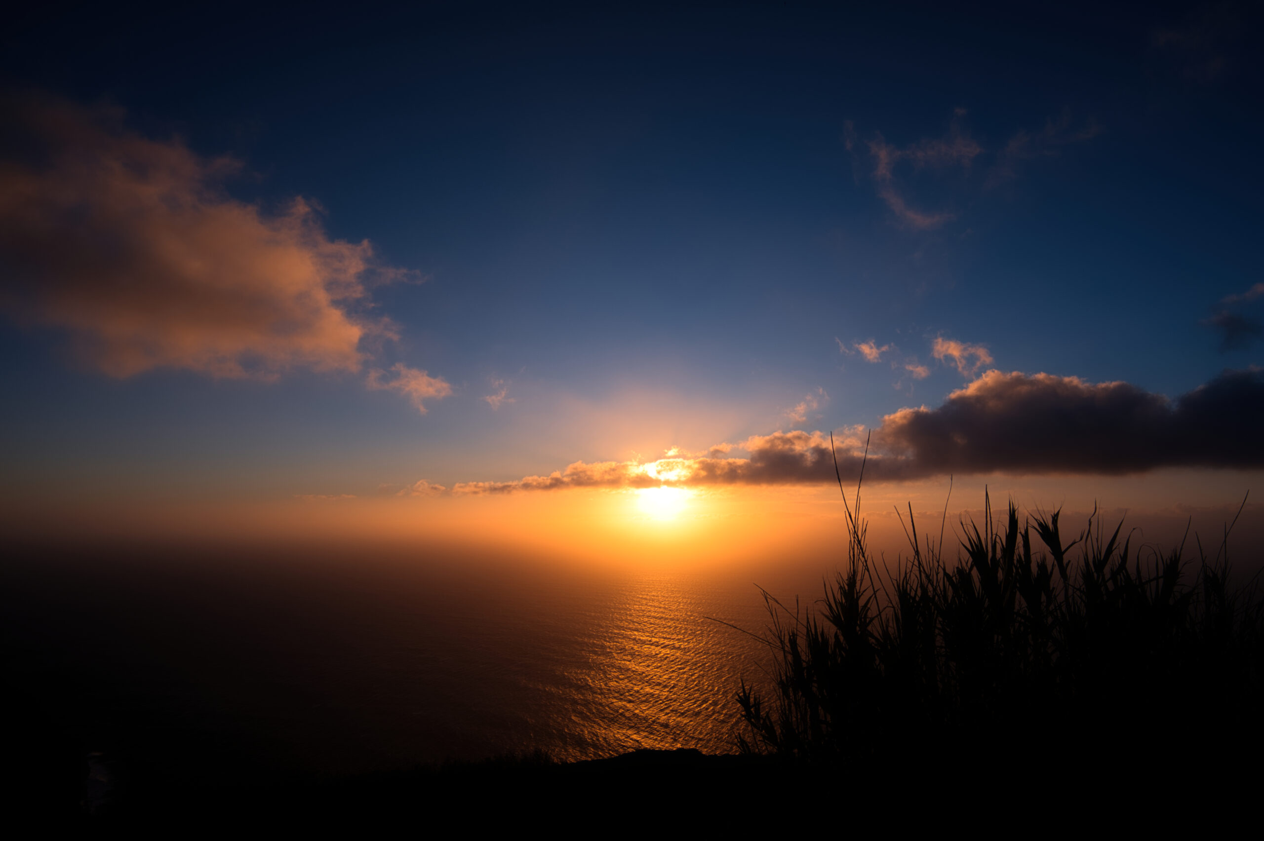 This peaceful capture of a sunset masterfully portrays the serene beauty of the moment. The golden rays of the setting sun cast a warm glow across the vast sea, contrasting sharply with the deep blues of the sky. The gentle, floating clouds in the distance add to the scene’s tranquility. The dark silhouettes of grasses and plants in the foreground provide a quiet balance and enhance the image’s depth. This scene exudes a calming stillness as the world gently transitions into night.