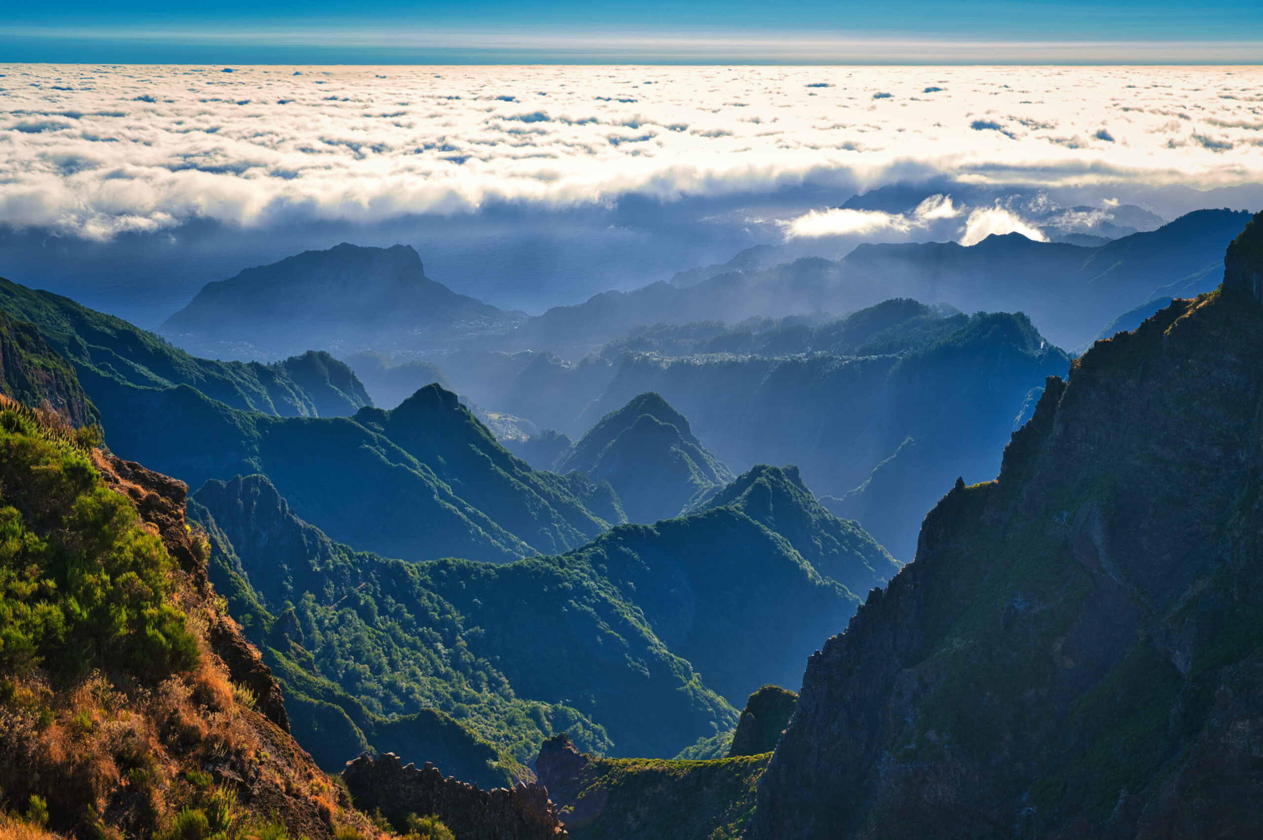This image captures the magical moment of a morning in the mountains, where the first rays of sunlight gently glide over deep valleys. The rugged mountain peaks, bathed in lush green, stand in stark contrast to the soft blanket of clouds in the background. The light illuminating the landscape creates a dreamy atmosphere, while the mist enveloping the valley adds an almost mystical feel. This picture invites the viewer to savor the serene and sublime beauty of nature.