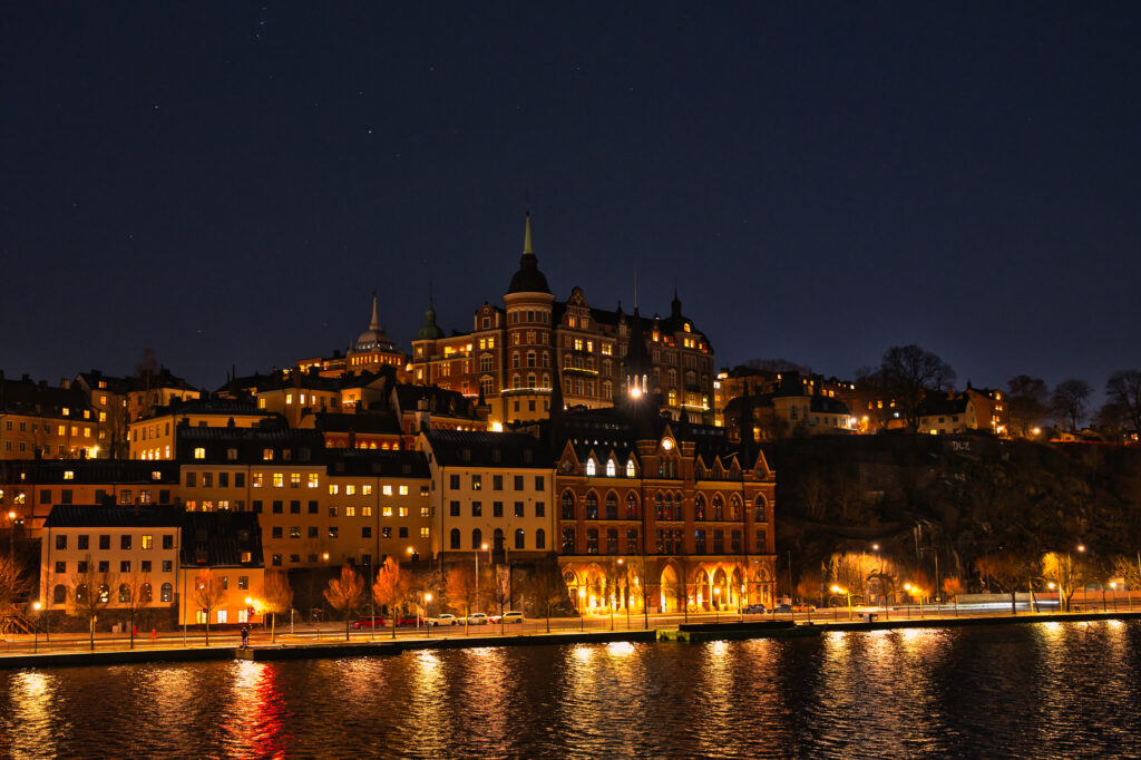 Perched above the water, the nighttime silhouette of Södermalm reveals one of Stockholm’s most charming districts. The warm lights of the houses gently reflect on the dark current, giving the scene a welcoming glow. The historic architecture, with its turrets and ornate facades, evokes a bygone era, while the clear night sky adds a timeless quality. Here, history and modernity blend in a captivating play of light.