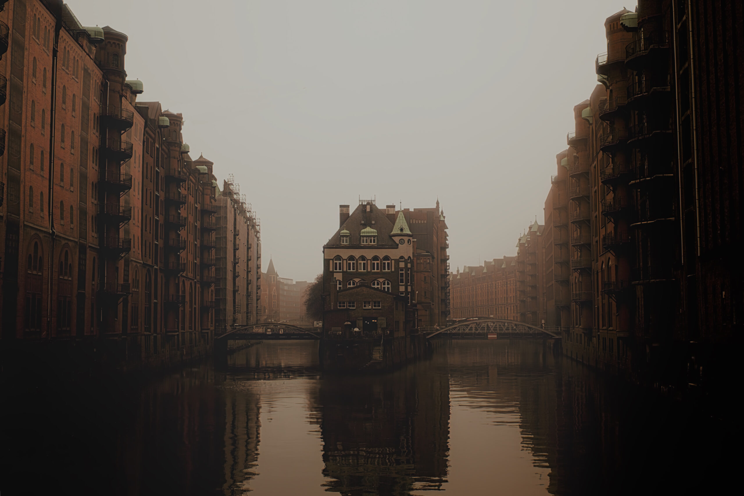 Shrouded in dense fog, Hamburg’s Speicherstadt unveils its mystical charm. The iconic Wasserschloss stands like an enchanted relic among the imposing brick buildings, its reflection gently mirrored in the calm water. The muted color palette of browns and greys accentuates the quiet melancholy of the scene, while the perspective draws the viewer’s gaze deep into the image. A moment where the past comes alive and time seems to stand still.