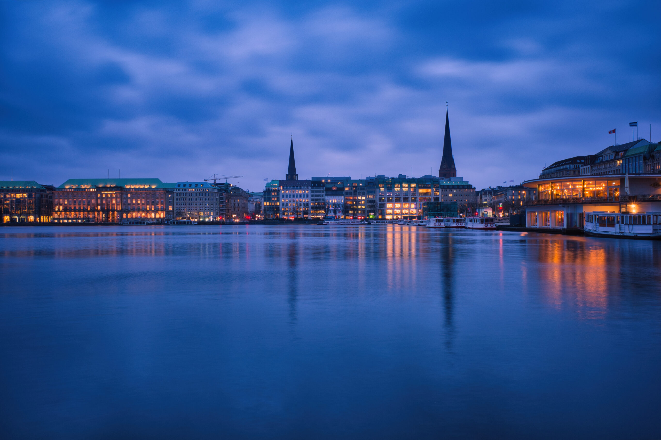 This enchanting shot captures the peaceful morning calm over the Alster in Hamburg. The gentle illumination of the waterfront buildings reflects in the calm water, creating a magical play of light and colors. The two church spires rise majestically above the skyline, adding a touch of grandeur to the scene. The deep blue hue of the sky enhances the fresh and tranquil atmosphere, making this moment truly special.