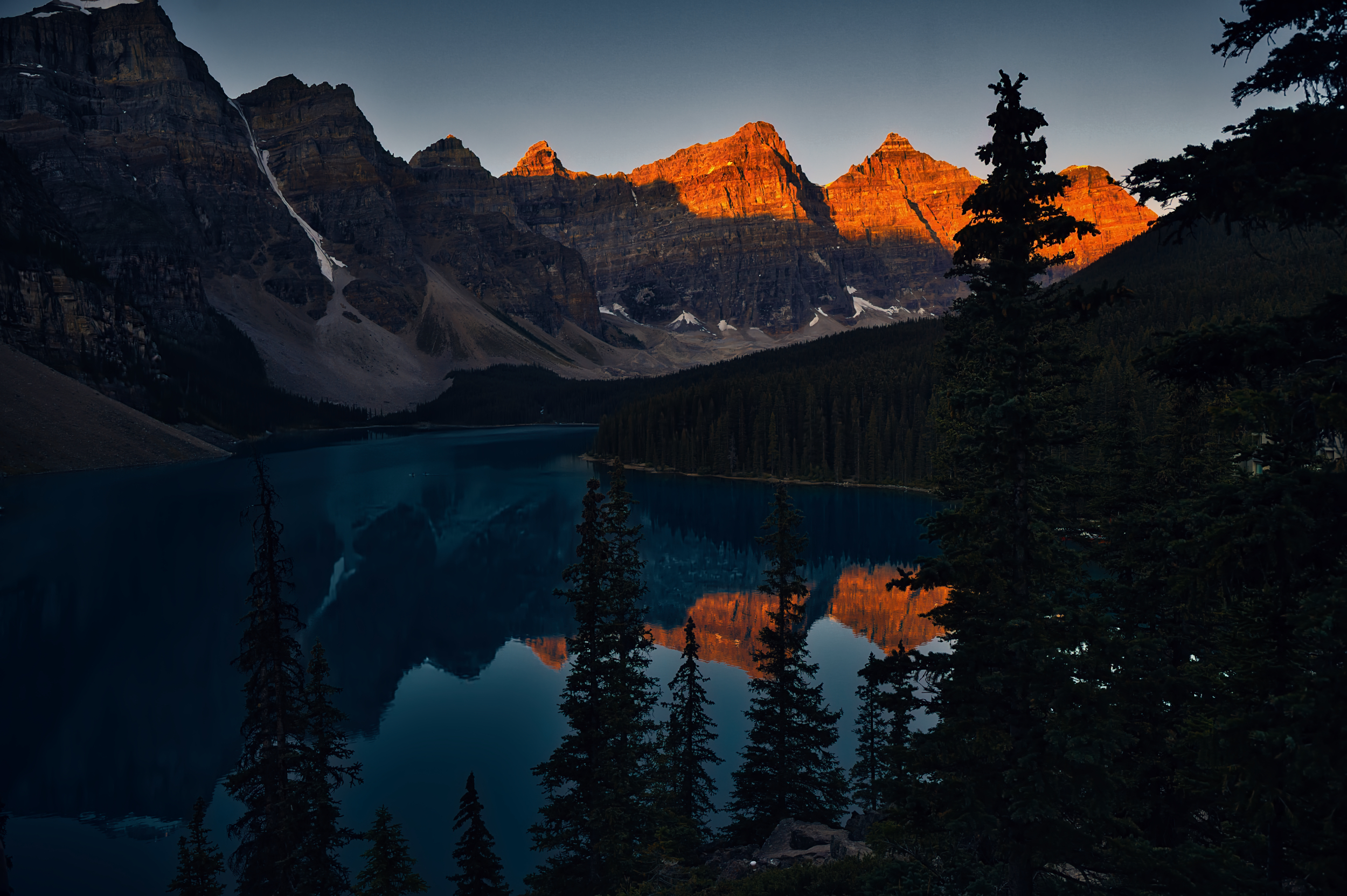 The first rays of sunlight ignite the peaks of the Canadian Rockies in a vibrant orange, while Moraine Lake rests in deep, tranquil blue. The water mirrors the glowing mountains like a silent witness to this majestic moment. The darkness of the forest in the foreground intensifies the contrast, making the play of light even more powerful—a scene between night and day, silence and brilliance.
