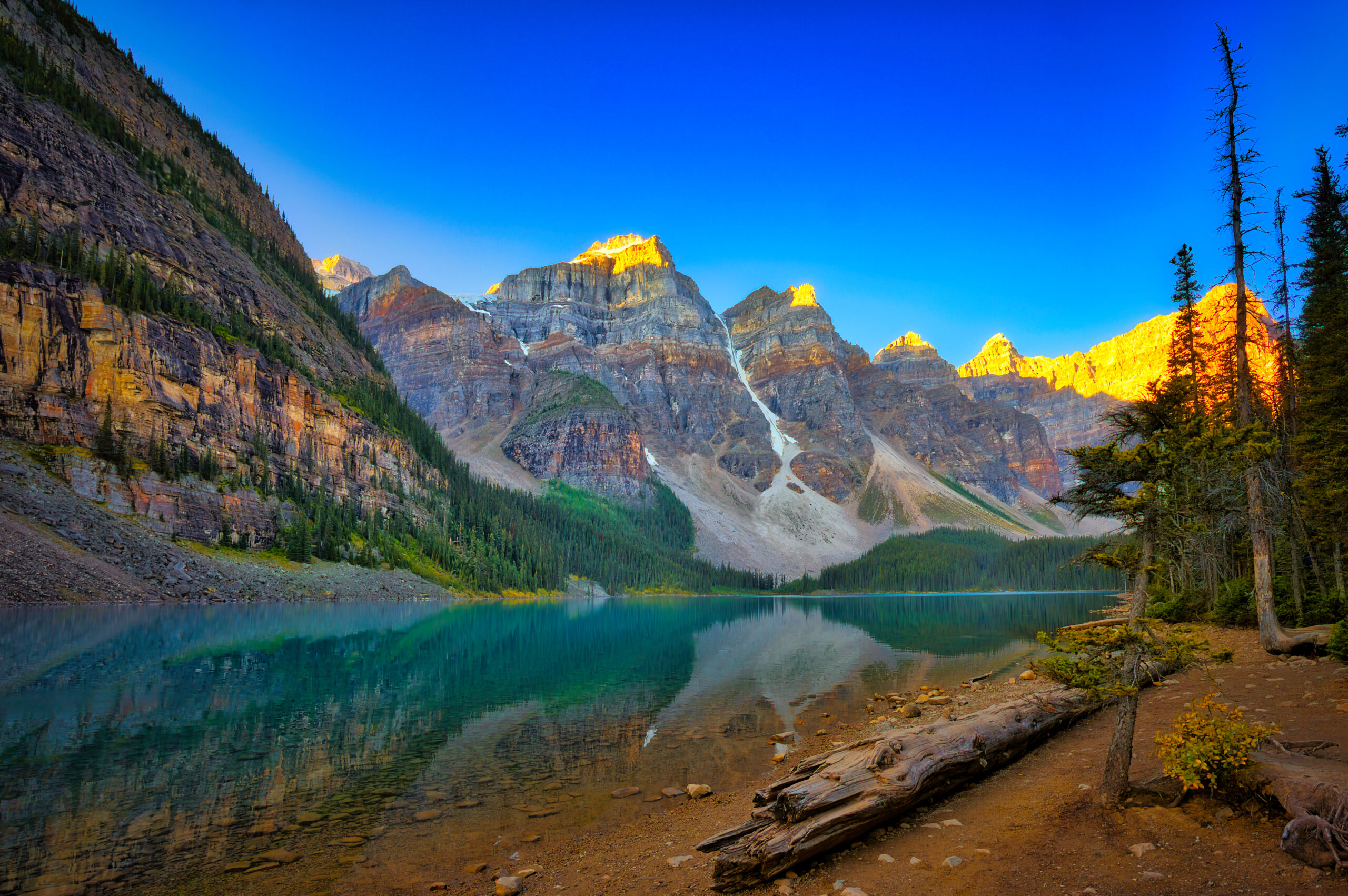 Crystal-clear turquoise water mirrors the majestic peaks of the Canadian Rockies, their summits glowing in the golden light of sunrise. Fallen logs rest along the shore among pines and rocks, while the calm surface reflects every contour of the landscape. The vivid blue sky blends seamlessly with the cool tones of the lake, emphasizing the valley’s vast depth. In the crisp morning air, a sense of grandeur and stillness prevails—a perfect harmony between light and nature.