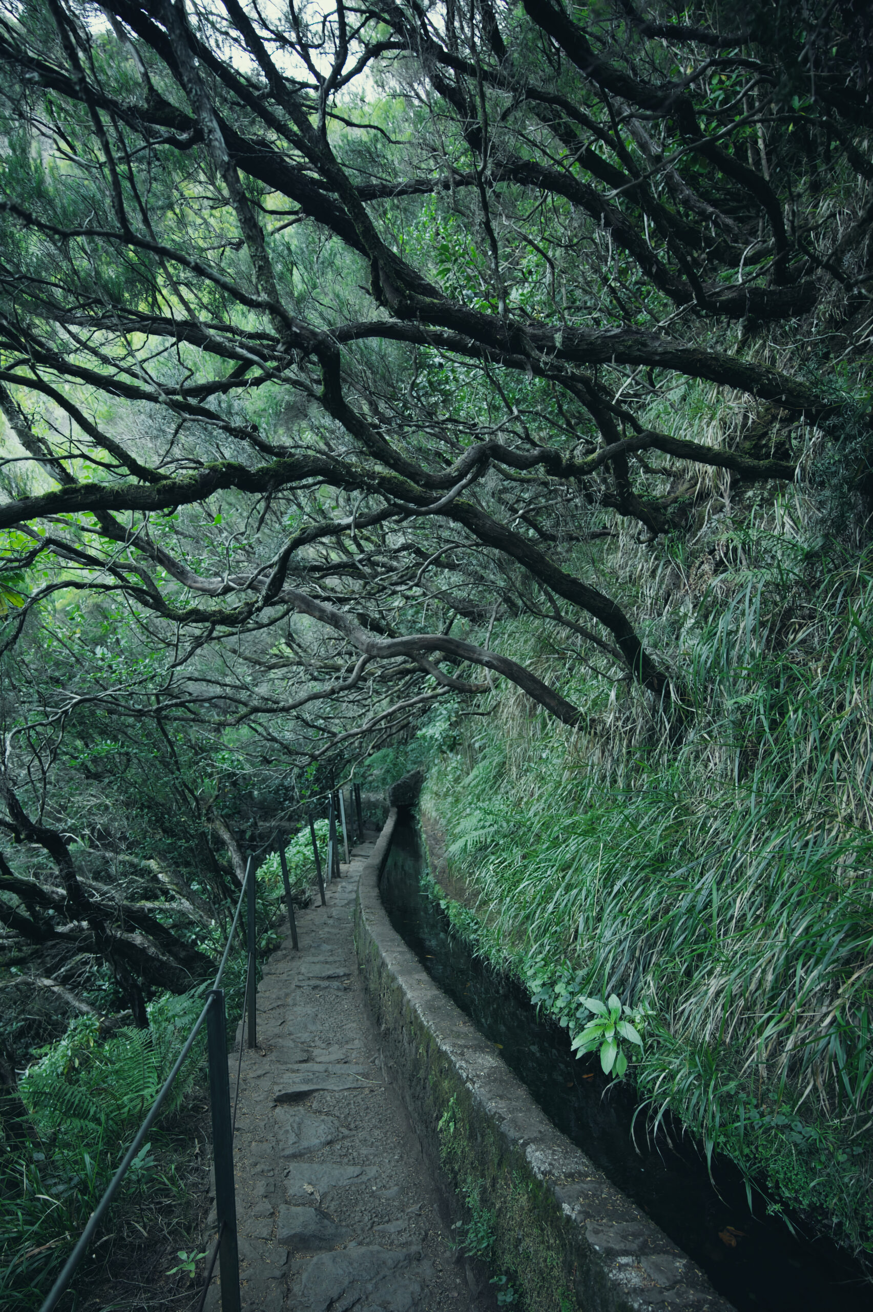 This photograph takes us into the heart of a dense, ancient forest along a Levada, one of Madeira’s traditional water channels. The stone path winds mystically through lush greenery as gnarled branches stretch overhead like fingers, almost reaching out to touch passing wanderers. The contrast between the vibrant green foliage and the calm, shadowed watercourse creates an atmosphere of seclusion and serenity. This image tells stories of adventure, a deep connection to nature, and quiet, untold beauty.