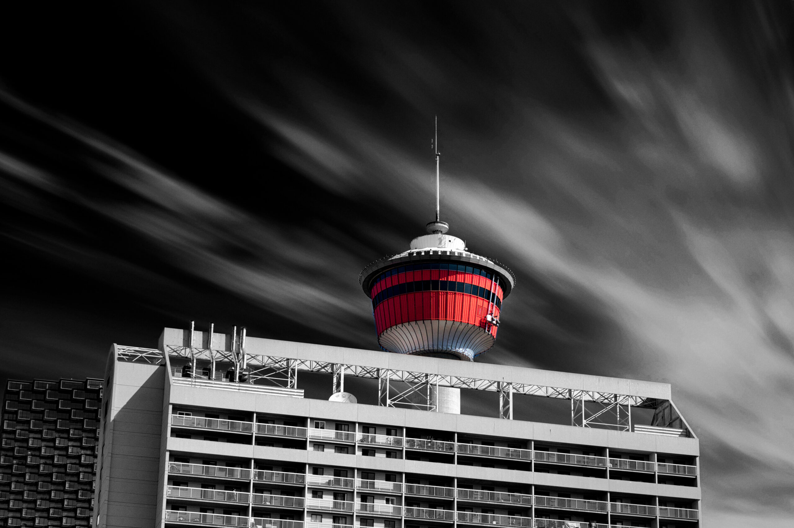The Calgary Tower rises above the rooftops of downtown, its bright red top creating a striking focal point. In the foreground, a monochrome high-rise dominates the frame, with its straight lines and rectangular window rows contrasting with the circular form of the tower. The sky shows streaks of clouds moving diagonally across, adding a sense of motion. The selective use of color immediately draws attention to the tower’s top, while the rest of the architecture remains in grayscale.