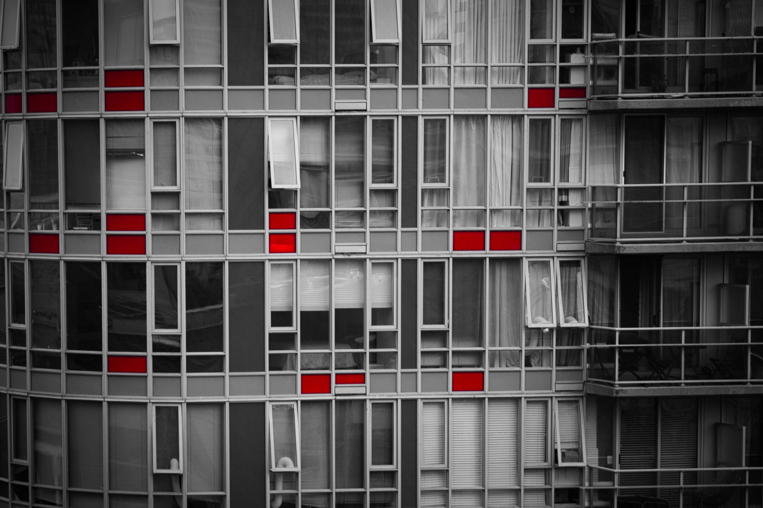 The facade of a modern residential building is structured by a uniform grid of windows and balconies. Curtains, blinds, and glass surfaces vary in form and texture, creating a lively pattern. Among the predominantly gray elements, individual red panels stand out, breaking the strict rhythm of the architecture and adding striking visual accents.