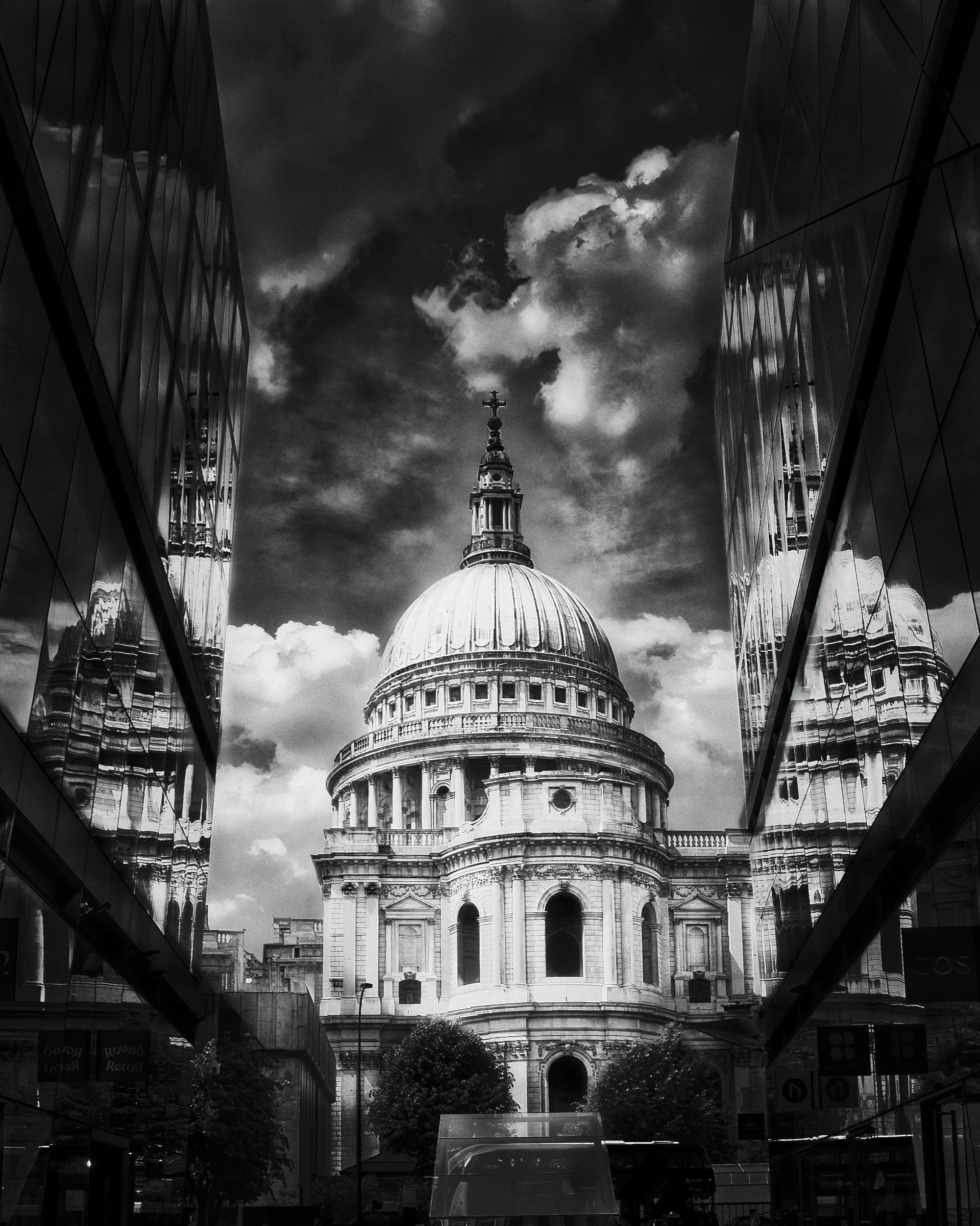 The dome of St Paul’s Cathedral rises at the center of the composition, framed by two modern glass facades. The reflective surfaces mirror parts of the cathedral, enhancing the strong symmetry of the scene. The architectural lines create a visual corridor that naturally guides the viewer’s eye toward the historic dome. Above it, dramatic cloud formations emphasize the monumentality of the building and highlight the contrast between classical architecture and the modern cityscape of London.