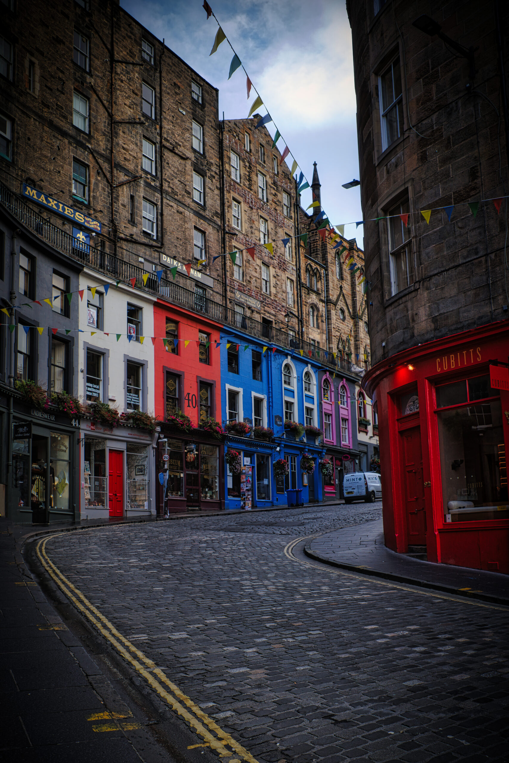 This charming old-town street seamlessly blends the past and vibrancy into a harmonious scene. The cobblestone road gently curves around the colorful façades of the houses, breaking up the gray stone of the historic town like a rainbow. Above, bunting sways in the breeze, as if whispering tales of festivities and encounters. Each color feels like its own chapter, from radiant red to deep blue. The scene beckons you to wander through the street, getting lost in the quaint shops and cafés that breathe stories and memories.