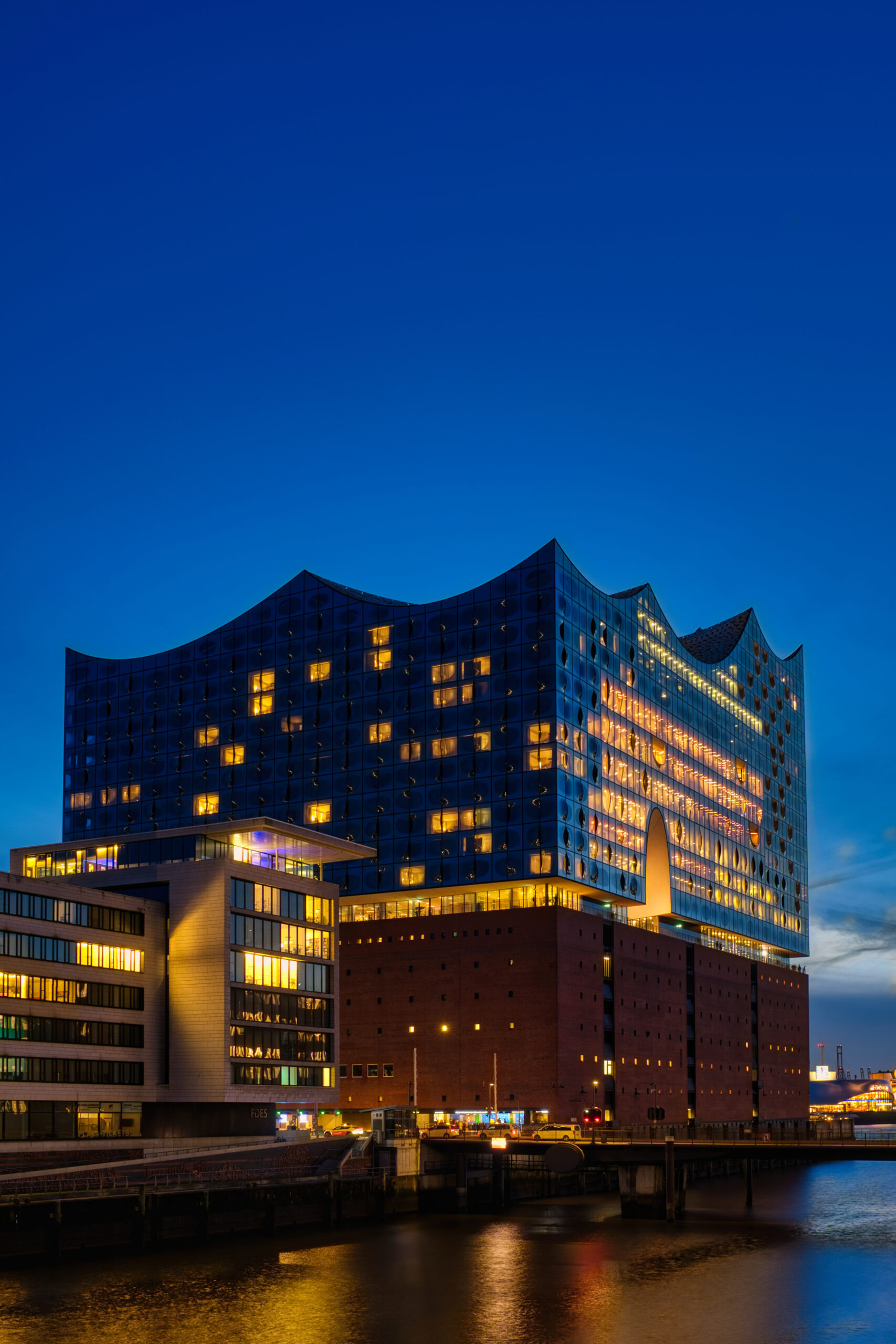 The Elbphilharmonie rises majestically over the harbor, as the blue hour paints the sky in a deep, calming hue. The warmly glowing windows tell stories of life and music unfolding behind the iconic glass façade. The contrast between the historic brick base and the futuristic architecture above merges Hamburg’s past and future in a single frame. The serene harbor gently reflects the light, enhancing the elegance of this cultural landmark.