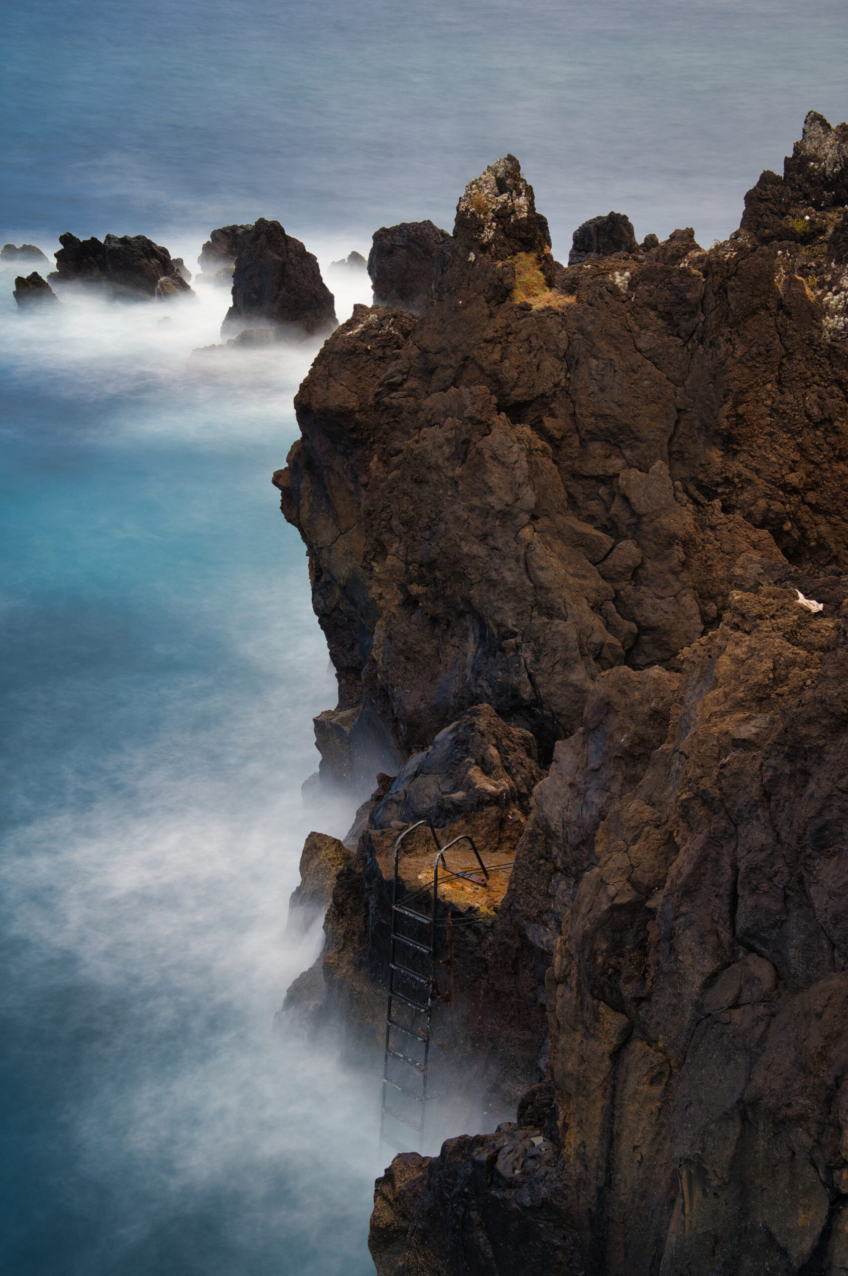 This image captures a solitary ladder leading down from rugged cliffs into the rushing sea. The long-exposure shot transforms the waves into a gentle, misty blanket that envelops the hard, dark rocks. The contrasts between the soft water movements and the solid cliffs make the scene feel both tranquil and powerful. The ladder, descending into the mysterious depths, evokes a sense of adventure and curiosity, as if it is the only path into a hidden world beneath the water’s surface.
