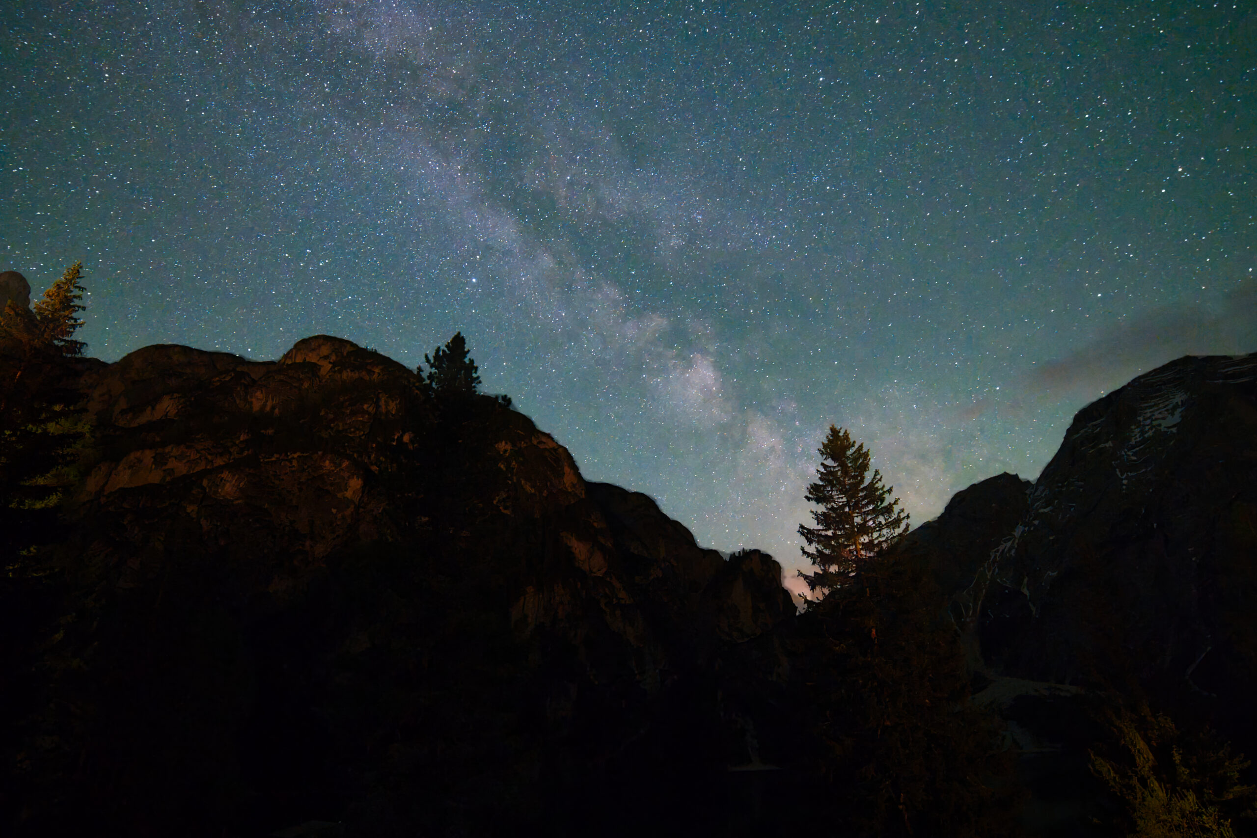 The mountains rest in complete darkness, while the sky above glimmers with a sea of stars. The Milky Way stretches like a luminous ribbon across the night, making the world below seem small and insignificant. Silence reigns, broken only by the faint whispers of nature. The lone tree silhouetted against the glittering sky stands like a guardian of the scene. It is a night that tells stories – of eternity, beauty, and the magic of the universe.
