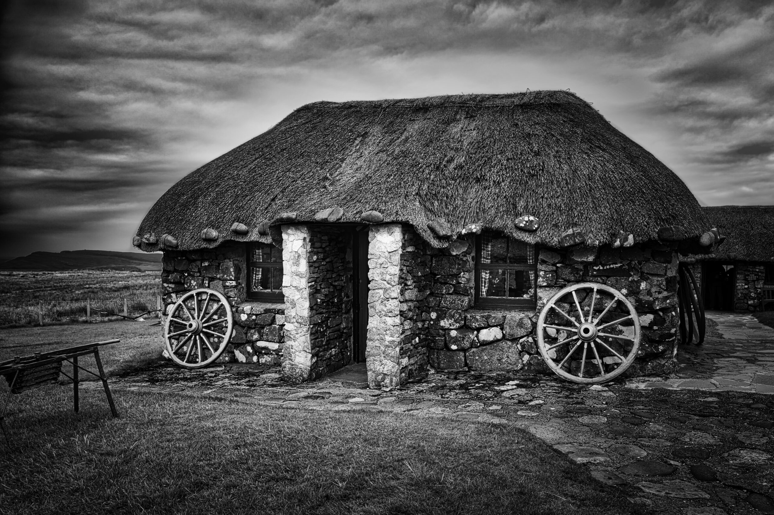 This black-and-white photograph depicts a traditional stone cottage with a thatched roof, set within a wide, rugged landscape. The frontal composition and balanced symmetry lend the scene a calm, almost meditative presence. The image speaks of permanence, simplicity, and quiet resilience against the passage of time. Rather than documenting a place, it invites contemplation and emotional interpretation, making it a timeless visual statement.