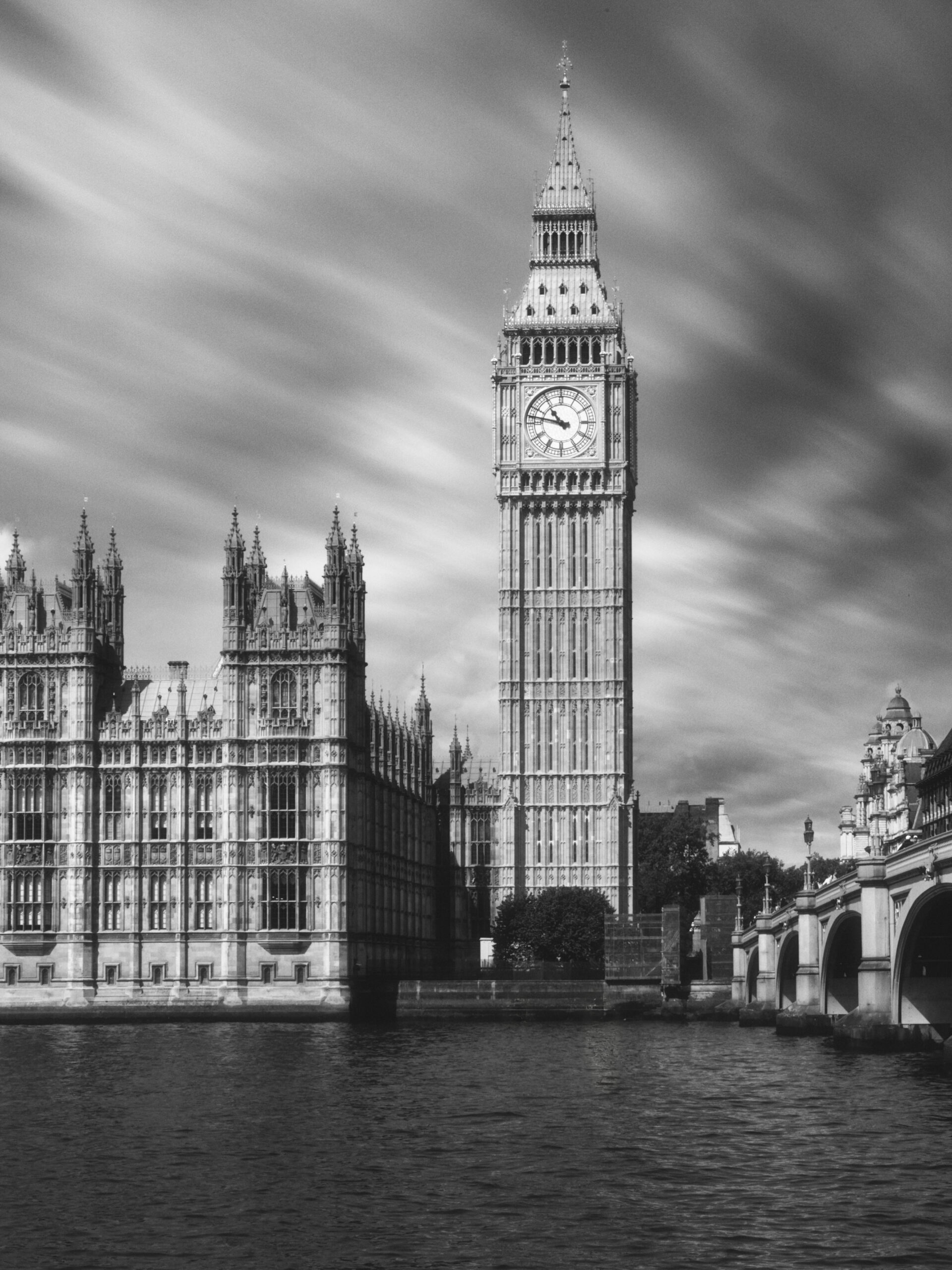 This black and white photograph captures the iconic Big Ben and the Houses of Parliament in London. The long exposure creates dynamic and flowing clouds in the sky, providing a dramatic contrast to the solid, detailed architecture of the historic building. The calm waters of the Thames in the foreground enhance the timeless elegance of the scene, amplifying the sense of permanence and grandeur.