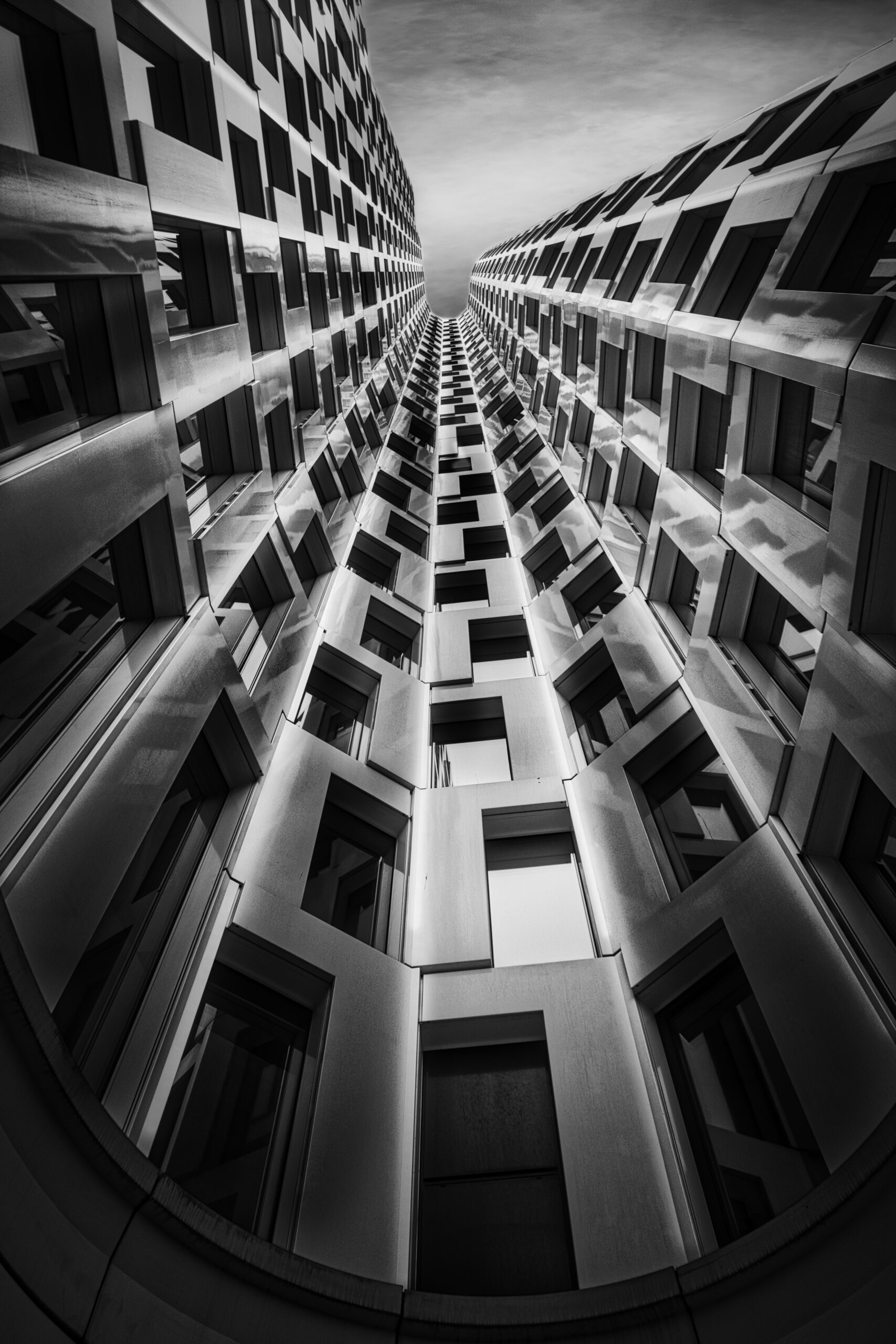 “Vertical Illusion” explores the abstract poetry of contemporary architecture. The upward perspective transforms the façade into an endless geometric ribbon stretching toward the distance. Light and shadow accentuate the rigid structure, while the gentle curvature at the base introduces a subtle sense of motion. The image plays with perspective, rhythm, and depth—turning a building into a sculptural, almost surreal visual experience.